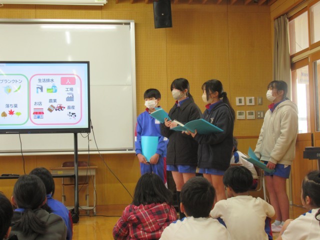 5学年は那珂川のフナの放流の経験をもとに、どんな那珂川にしていきたいかについて、6学年は節水、排水に気を付けた調理「エコクッキング」を中心に発表しました。