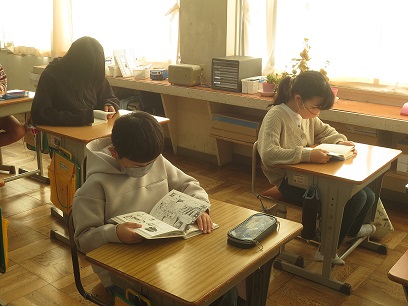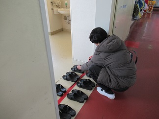 時計を見て読書をする児童。トイレ使用後に使ったサンダルをそろえる児童。雨上がりの月曜日、どの児童も元気に生活することができました。