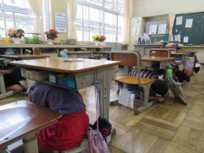 地震発生の放送を静かに聞き、机の下に身を隠すことができ、