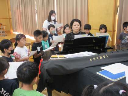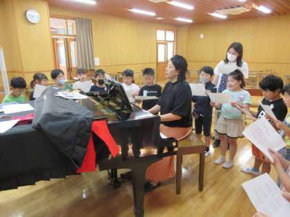 11/3(金)に予定している150周年記念式典に校歌を歌うので、上手に歌えるように練習しています。昨年度までPTAだった清水谷英子さんにレッスンをしに来ていただきました。上手に歌えるように、伴奏をしながら、子供たちに指導をいてくださいました。当日は、みんなの素敵な歌声を三反田小から、響かせることができるでしょう。