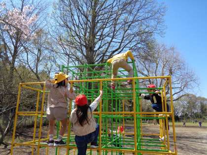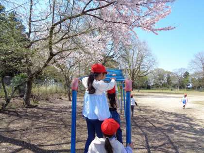授業では、良い姿勢でお話を聞いたり、しっかり発表したりと、がんばっていました。休み時間には、満開の桜の下で楽しく遊びました。