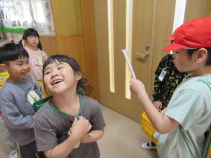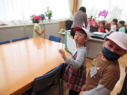 2年生が1年生と交流しました。2年生は、校歌とアサガオの種をプレゼントしました。それから、お互いに名刺交換をして、自己紹介をしました。それが終わったら、校長室や理科室を6人ぐらいのグループで見て回りました。2年生がリーダーになって、たくさんの教室を案内しました。2年生は、教室を案内したら、1年生にシールを貼ってあげました。シールをもらった1年生は、とても喜んでいました。