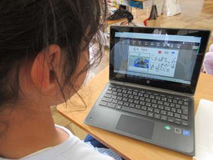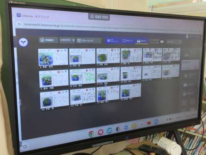 1年生は、生活科の学習で、アサガオを一人一鉢ずつ大切に育てています。そのアサガオをタブレットで撮影し、各自のデジタル観察カードに写真を貼り付けました。続いて同シートのあいている部分に、アサガオに付けたオリジナルの名前と、観察して気付いたことを手書きで入力し、一枚のカードに表現〔アウトプット〕しました。その後、提出BOXの機能を使ってデータを教師に送信。クラス全員の観察カードが電子黒板に映し出されると、歓声が上がりました。