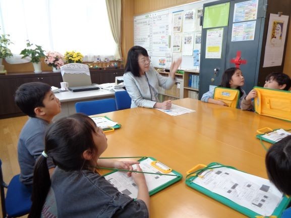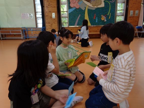 3、4校時に1年生と2年生で三反田小の学校(校内)探検を行いました。はじめにファンタジールームで2年生が1年生に向けて校歌を歌い、1年生にアサガオの種をプレゼントしました。次に1、2年生が5~6人の混合グループで名刺交換や自己紹介をした後、グループごとに学校探検をしました。各教室や職員室、校長室、保健室などじっくりと見て回りました。2年生は1年生に校内の案内をしたり、1年生のワークシートにシールを貼ってあげたりと大活躍でした。