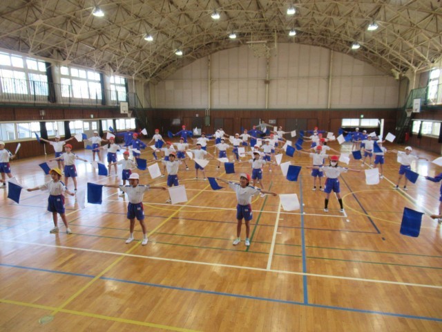 4~6年生は、旗を持って、ダンスの振り付けを確認しました。