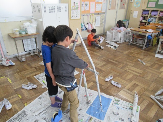 子供たちは思い思いに工夫しながら、ぼうしやスカート、テントなど、いろいろなものを作っていて、教室中に笑い声が広がっていました。