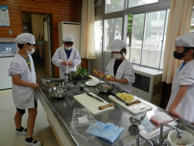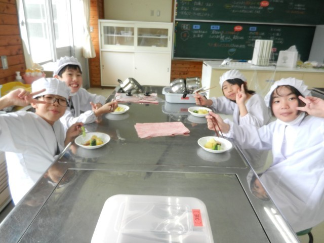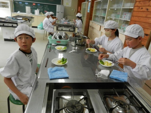 5年生の調理実習が1、2時間目に行われました。「青菜(小松菜)のおひたし」と「ゆでいも」をみんなで協力しながら、楽しそうに作っていました。完成した料理を食べながら、「おいしい」「ちょーうまい」「しょっぱい」など、いろいろ感想を言いながら食べていました。怪我することなく調理実習を終えることができました。片付けもみんなで協力して手際よくできました。