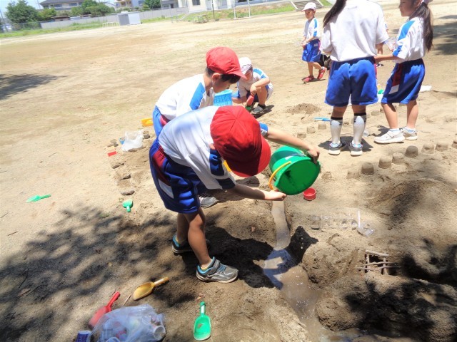 梅雨の晴れ間に、1年生が校庭の砂場で砂遊びをしました。