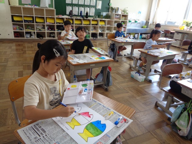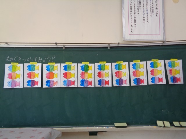 本日、図工の時間に初めて絵の具を使った学習を行いました。絵の具のパレットの使い方や絵の具の出し方など、基本的なことを教わり、3つの色を使って魚の絵に色をぬりました。誰もがきれいにぬろうと一生懸命に取り組み、出来上がった作品を満足そうに見ていました。