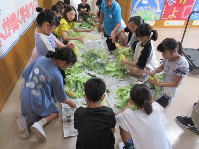 本日、4年生が、朝から今日の給食のためのトウモロコシの皮むきを行いました。