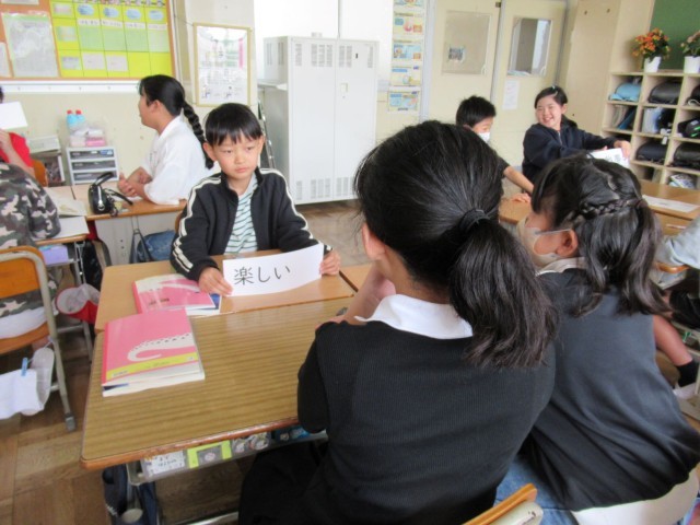 5年生の国語の授業です。一人がひみつの言葉のカードを持ち、持っている人は、そのカ...