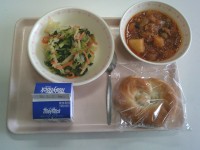 【献立】米パン 牛乳 チリビーンズ ガーリックドレッシングサラダ ...