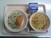 【献立】野菜たっぷりペペロンチーノ 牛乳 たらのレモンフライ 豆マヨサラダ ...