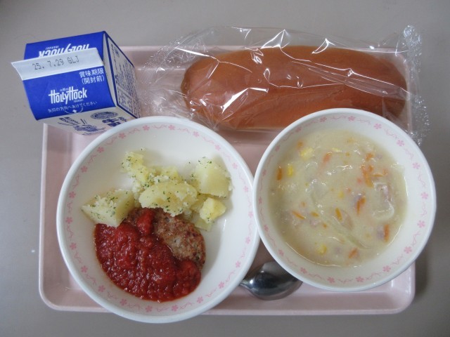 【献立】はちみつパン 牛乳 ハンバーグトマトソース こふきいも 米粉と豆乳のコーンポタージュ