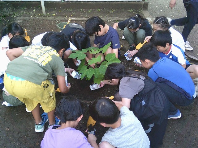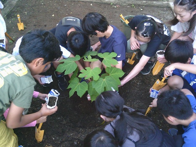 本日(7/17)朝、「平和」への意識を高める一助とするため、広島市から分けていただいたアオギリの苗木を植樹しました。各学級代表1名ずつが土を寄せ、踏み固めて植えている様子です。