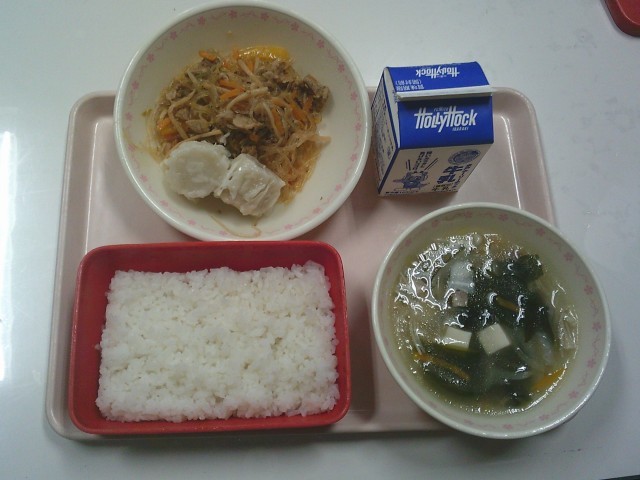ごはん 牛乳 えびしゅうまい 春雨のカラフル炒め わかめスープ