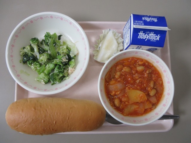【献立】はちみつパン 牛乳 ポークビーンズ グリーンサラサ 梨