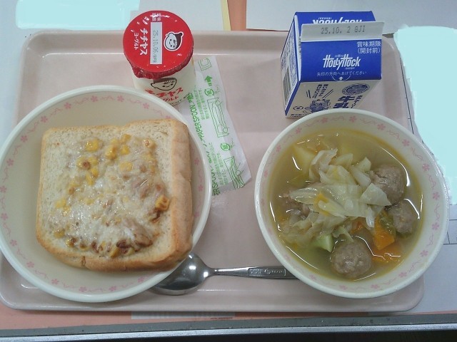 コーンマヨネーズトースト 牛乳 肉だんごと野菜のスープ煮 ヨーグルト