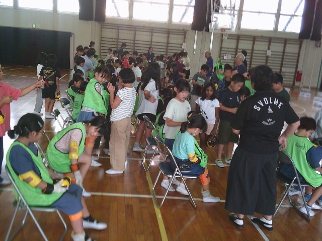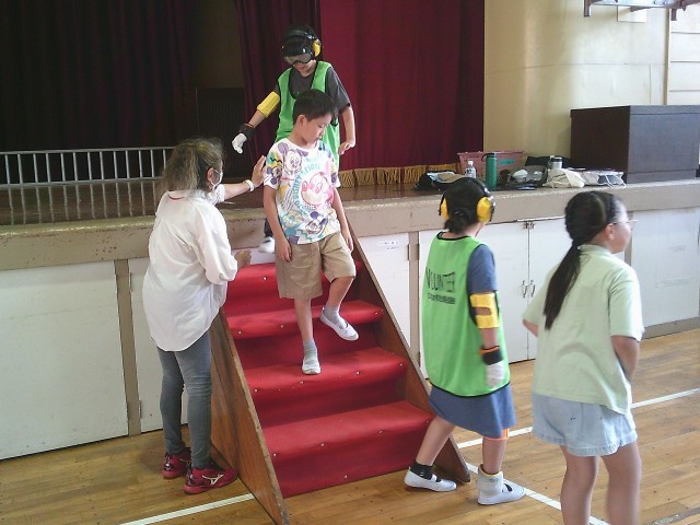 本日(9/19)、3・4校時に、4年生が、総合的な学習の時間で「高齢者疑似体験」をおこないました。社会福祉協議会のご協力で、膝・肘や指先が思うように動かない、目がよく見えない、耳がよく聞こえない状態を体験しました。