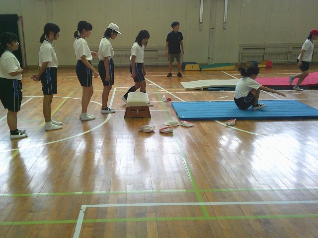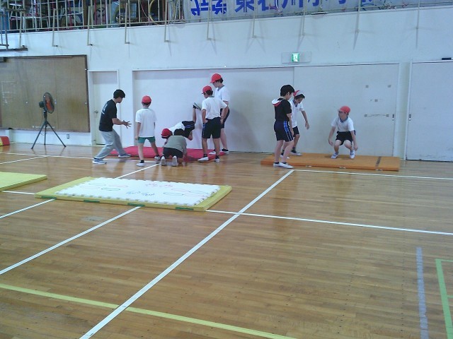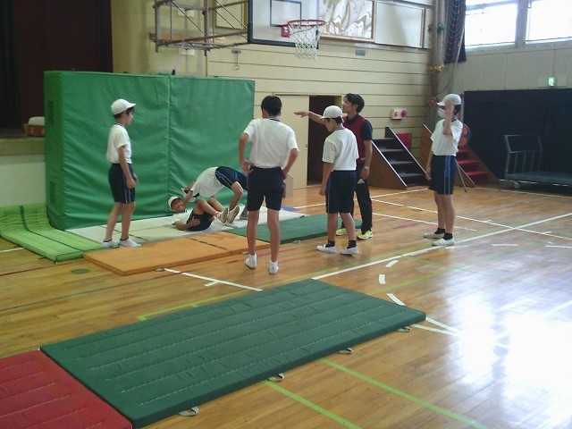 本日(10/7)1~3校時、6年生体育の授業にゲストティーチャーをお招きしました。写真は1校時の6年2組の様子です。4つに分かれたマットではそれぞれ違う運動をおこない、ローテーションでブリッジ系や支持系、前・後転の運動に取り組んでいました。