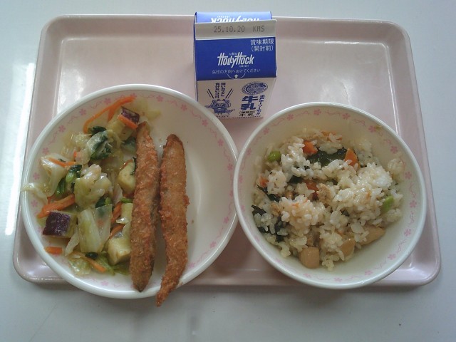 わかめ五目ごはん 牛乳 ししゃもフライ さつまいものガーリックサラダ