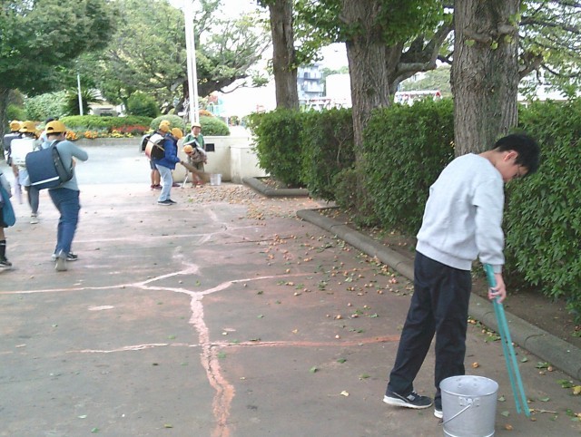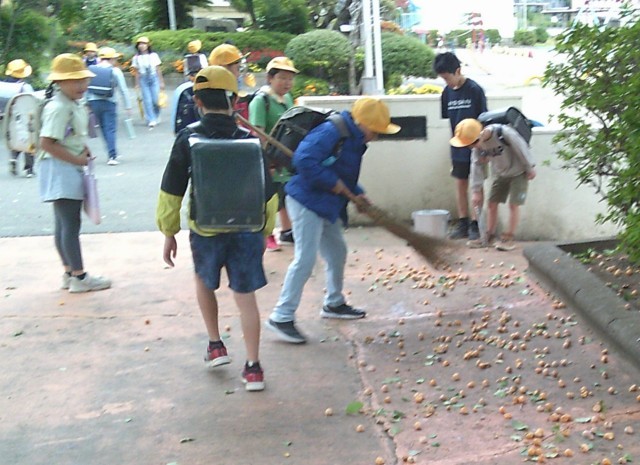写真は本日(10/9)の朝の様子です。先週から熟したギンナンが少しずつ落ち始め、今朝の強風で大量に落下していました。歩きやすいように通路掃除をしていると、数名の児童が匂いも気にせず、ギンナン集めを手伝ってくれました。