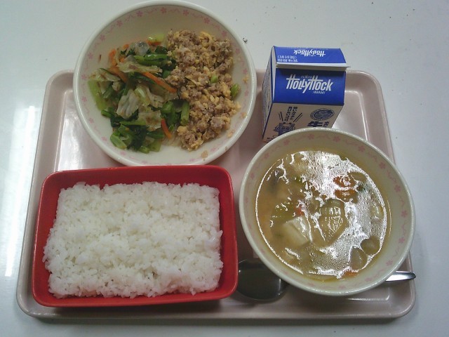 ごはん 牛乳 いろどり肉そぼろ おかかあえ みそけんちん汁