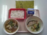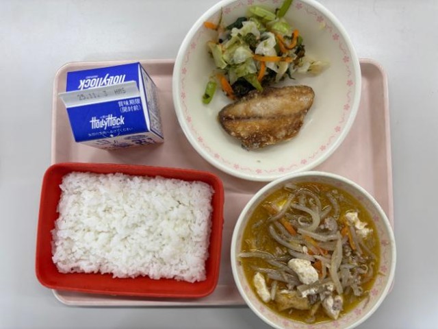 【献立】ごはん 牛乳 あじのレモン醤油ソースがけ 磯香あえ もやしたっぷりごまみそ汁