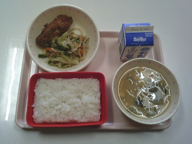 ごはん 牛乳 さわら甘こうじ立田揚げ ごまあえ じゃがいもと玉ねぎのみそ汁