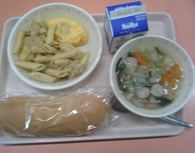 コッペパン 牛乳 トマトオムレツ ペンネソテー 玄米入り野菜スープ