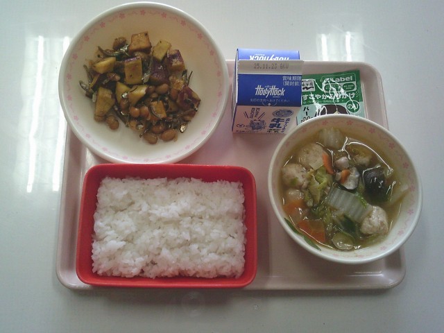 ごはん のりふりかけ 牛乳 鶏肉の塩ちゃんこ 大豆とさつまいもの甘辛揚げ