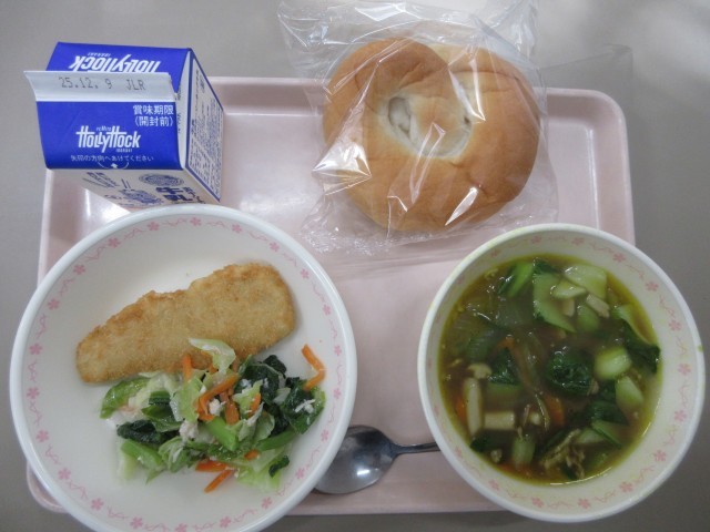 【献立】米パン 牛乳 いわしフライ 小松菜サラダ カレースープ