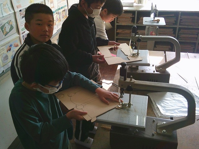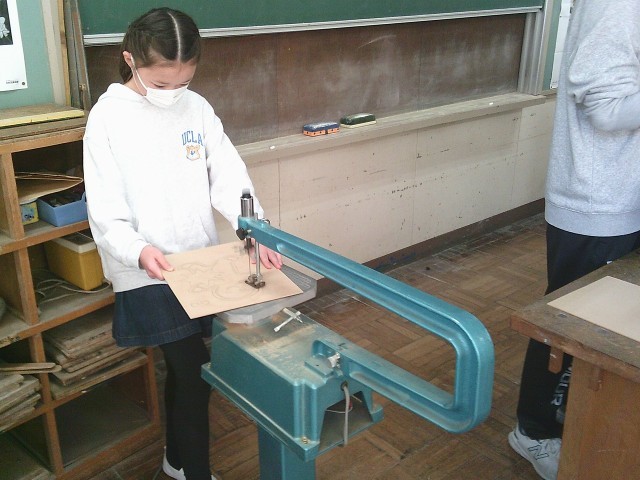 本日(11/27)4校時、5年1組の図工「糸のこスイスイ」での活動の様子です。図工室の電動糸のこぎりを利用して、思い思いの形に板を切り抜いていました。