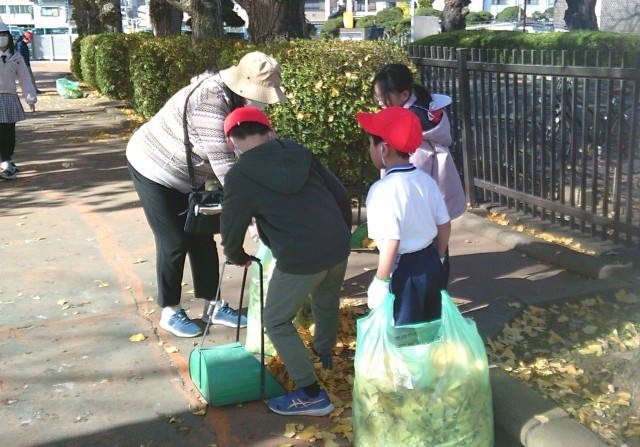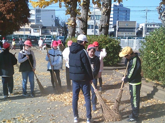 本日(12/1)から縦割り班活動で落ち葉掃きのボランティア活動をおこないます。写真は、初日の中休み、1・2班の児童が通路や校庭のイチョウや桜の落ち葉を集めている様子です。