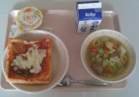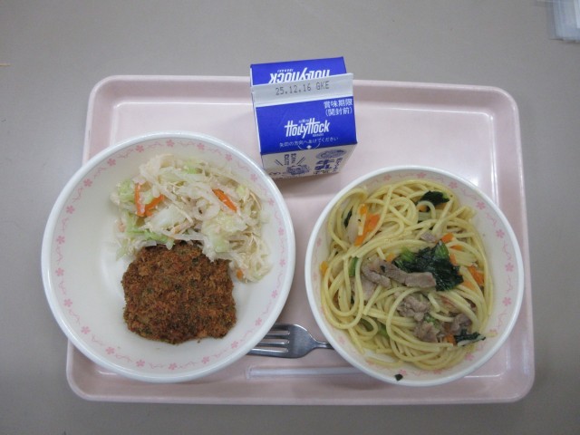 【献立】和風スパゲッティ 牛乳 たらのあおさフライ チキンサラダ