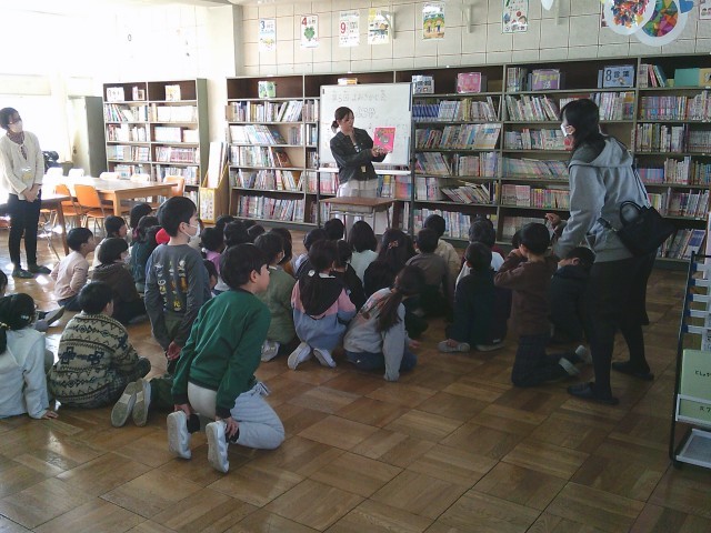 本日(12/5)昼休み、「父母と先生の会」教養厚生委員会による絵本の読み聞かせが図書室でおこなわれました。今回は「でんにゃ」という題名の本です。お昼の放送での宣伝もあり、目を輝かせた子どもたちが図書室に集まっていました。