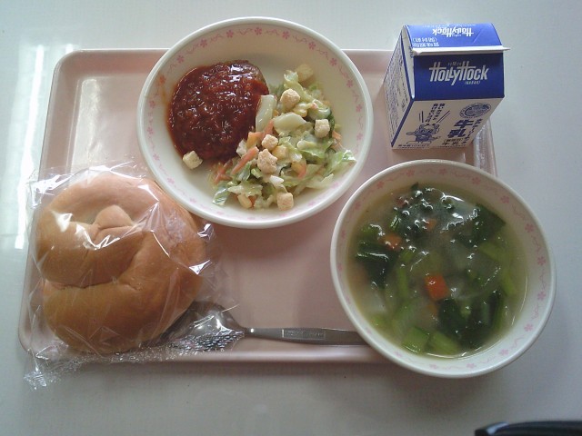 ミルクパン 牛乳 ハンバーグトマトオニオンソース クルトンサラダ マセドアンスープ