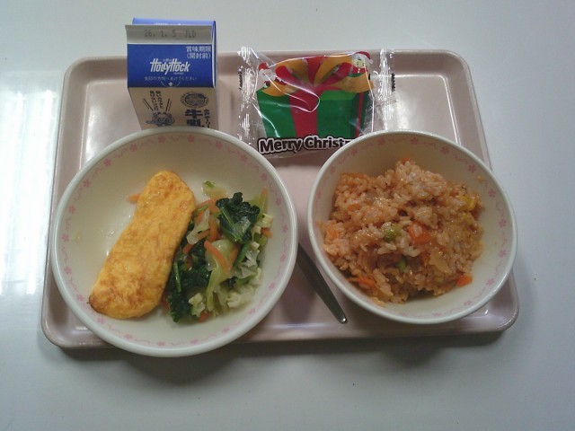 チキンライス 牛乳 オムレツ 小松菜とチーズのサラダ クリスマスデザート