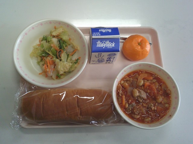 はちみつパン 牛乳 ポークビーンズ こんにゃくサラダ ぽんかん