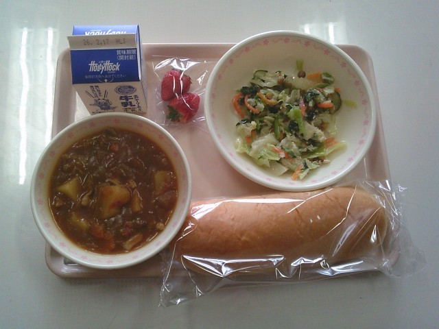 はちみつパン 牛乳 ブラウンシチュー 豆と麦のチキンサラダ いちご