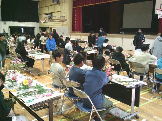 本日(2/13)3・4校時、今年度も県の出前講座にお願いして、華道体験を体育館でおこないました。講師の先生から華道の歴史や心などを教えていただき、写真のように花を活けました。