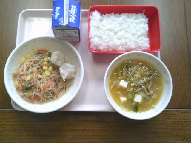 ごはん 牛乳 えびしゅうまい 春雨のカラフル炒め もやしのタンタンスープ
