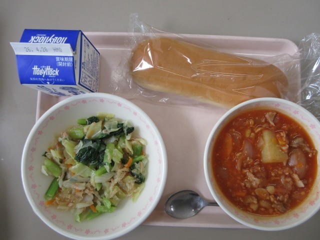 【献立】はちみつパン 牛乳 ポークビーンズ 寒天入りヘルシーサラダ
