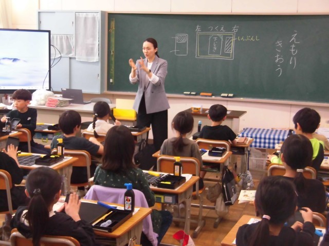 子供たちは、初めて使う道具に興味をもちながら、先生の説明をよく聞き、使い方を一つ一つ確認していました。これから始まる毛筆の学習に向けて、意欲を高める時間となりました。