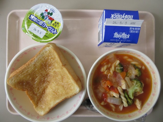 【献立】ハニートースト 牛乳 肉団子とマカロニのトマト煮 ヨーグルト