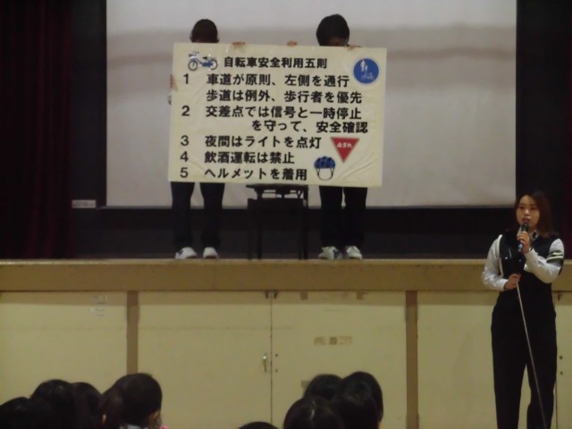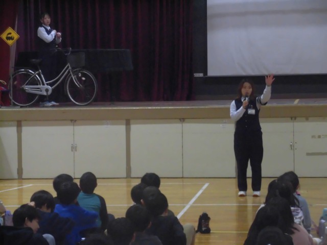 自転車安全利用五則について確認したり、交差点での安全確認の大切さを学んだりしながら、子供たちは真剣な表情で話を聞いていました。