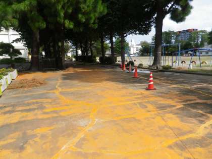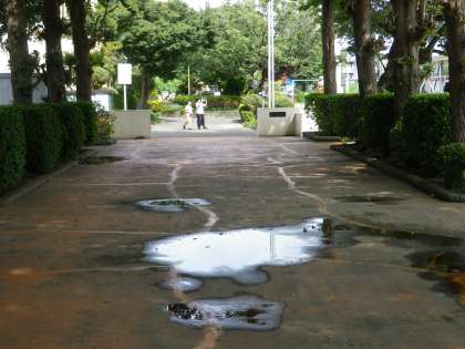 学校は、特に大きな被害もなく、本日は通常通り授業を行うことができました。西門付近の落ち葉や枝などは校務員さんがきれいにしてくれました。夏休み中におやじの会で掃除をした泉には、今回の豪雨により10cmほど水がたまっていました。