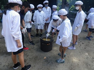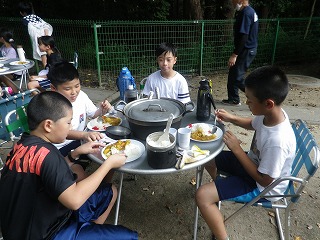 昼食のカレー作りました。班の友達と協力して、火をおこしてお米を炊いたり、カレーを作ったりしました。ごはんもカレーも十分な量で、おなかがいっぱいになりました。みんなで作ったカレーは、とてもおいしかったです。