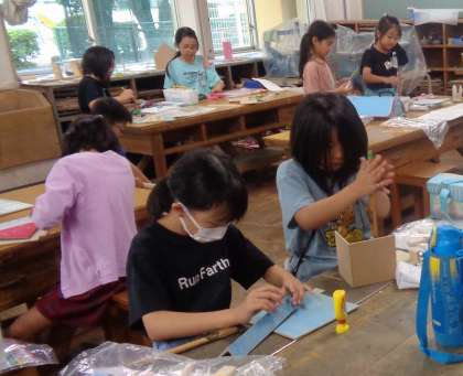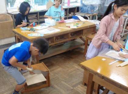 写真は4年生の図工の様子です。立体に表す活動で、のこぎり、金づち、きり等の道具を使い、木の板や木の棒を切って、つなげて、色を塗って、思い思いの作品作りに夢中で取り組んでいました。