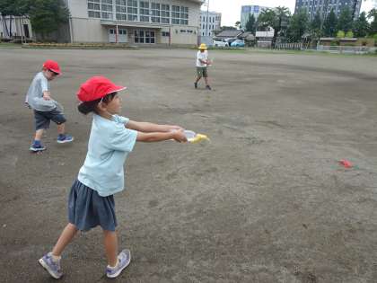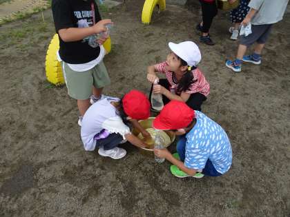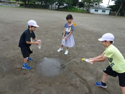 写真は、1年生生活科での水遊びの様子です。この学習では、今までの経験を基に、何を使うか考え、必要なものを用意して水遊をします。今日は、準備したペットボトルや調味料の空き容器等に加工を加えたものを使って実際に外で遊びました。様々な工夫が見られ、いろいろな水遊びを楽しむことができました。